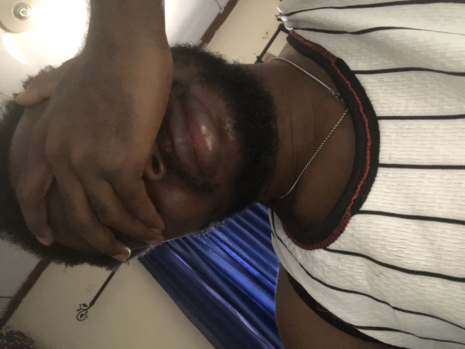 A male individual with dark skin, a beard, and short dark hair is depicted from the chest up in an indoor setting. His right hand is placed over his eyes and forehead, obscuring the upper portion of his face. His lower face, including his nose, slightly parted lips, and chin, is visible. He is wearing a white sleeveless top featuring vertical black stripes and a red trim around the neckline. A thin, silver-colored chain necklace with a small pendant is visible around his neck. In the background, a blue curtain is partially visible on the left side, and a ceiling-mounted light fixture is illuminated in the upper right. A dark, decorative rod or ornament is present in the upper left background. The specific location within Abuja, Nigeria, is not visually identifiable from the provided image.