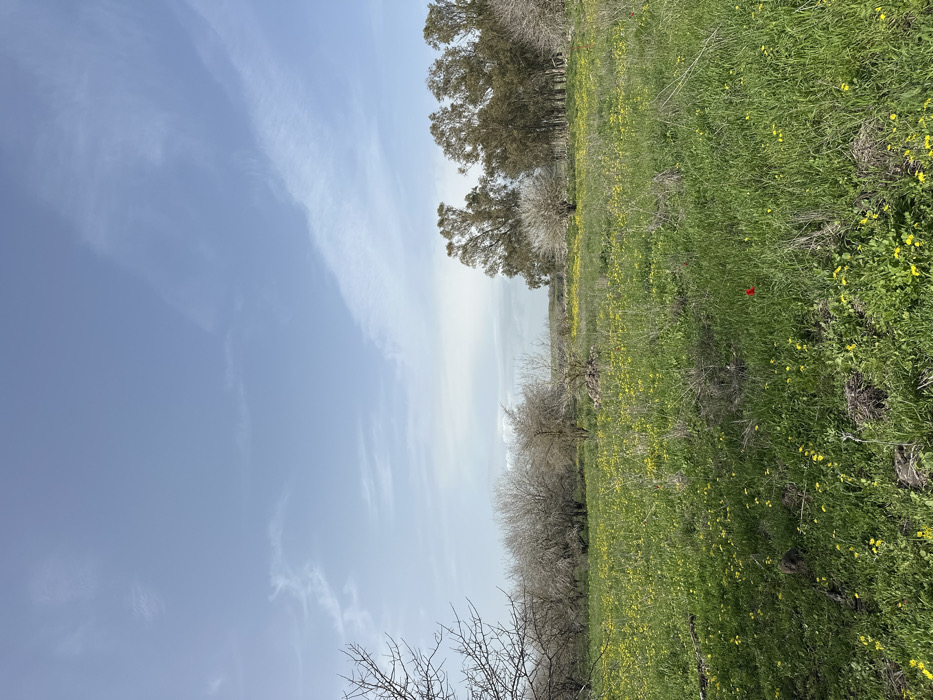 The image displays a panoramic outdoor landscape located in the Golan Regional Council, Israel. The upper approximately two-fifths of the frame consists of a light blue sky with scattered, wispy white cloud formations. The lower portion is dominated by a expansive field of green grass, densely interspersed with numerous small yellow wildflowers. A single vibrant red flower is prominently visible in the lower-right quadrant of this field. In the midground, a line of deciduous trees, largely bare of leaves, stretches from the left edge towards the center. Some of these trees exhibit a lighter, almost white coloration. A small, dark mound, possibly composed of rocks or earth, is situated among these trees in the mid-left. Towards the right side of the background, a denser cluster of taller trees with a darker, more prominent canopy of leaves stands against the horizon. No human figures, animals, or man-made structures are observed within the depicted scene. The lighting indicates clear daytime conditions, suggesting a seasonal transition of late winter or early spring due to the combination of bare deciduous trees and blooming wildflowers.