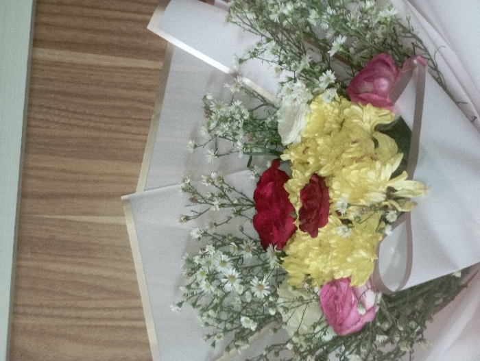 A medium-shot image depicts a floral bouquet placed against a light brown wooden background, featuring vertical grain patterns and a horizontal light-colored border at the top. The bouquet is composed of multiple flower types, primarily yellow chrysanthemums, several red roses, one pink rose, and numerous small white daisy-like flowers, possibly baby's breath. The bouquet is wrapped in multiple layers of light-colored, possibly white or cream, material with subtle gold or tan edging and secured with a light brown ribbon. Some rose petals show signs of minor wilting. The scene is static, devoid of human presence or overt action, within an unknown interior location in Unknown, Unknown.