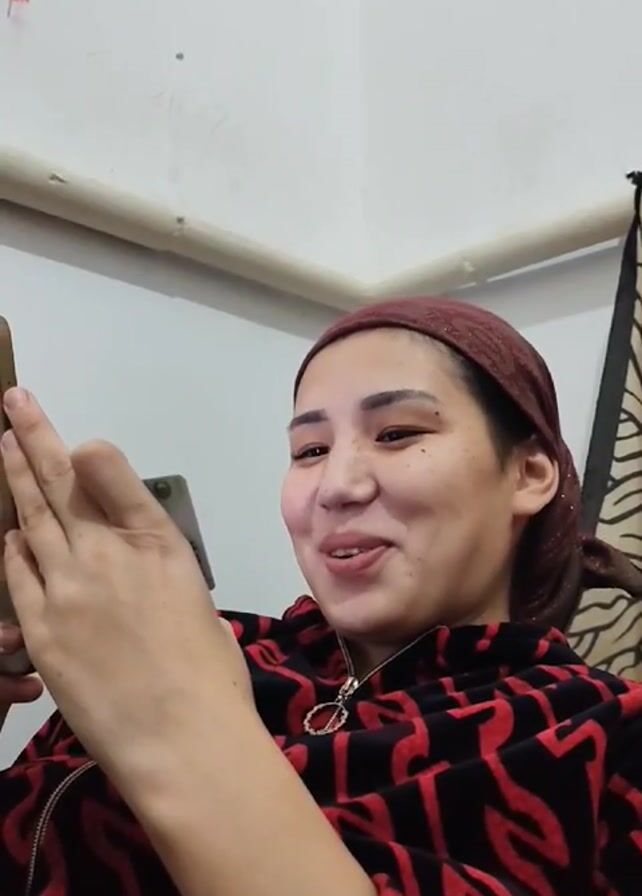 A woman is sitting and looking at her phone. She is wearing a red and black patterned top with a maroon headscarf. She has a pendant necklace on. She smiles at the screen of the phone. The background consists of a white wall, a wooden pole, and a patterned curtain.