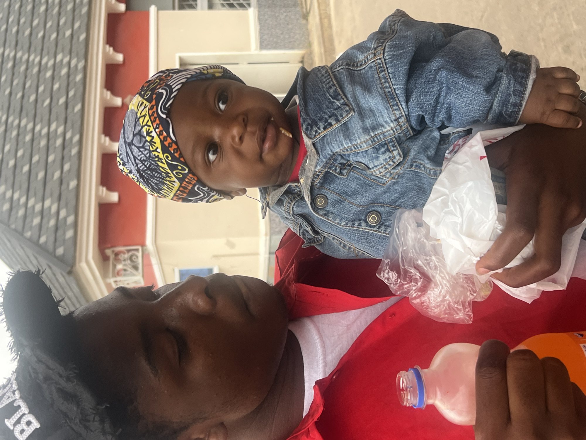 A medium, vertical shot features an adult holding a baby. The baby is wearing a colorful patterned head wrap and a denim jacket. The baby has food visible around their mouth. The adult is wearing a red shirt and a black cap. They are also holding a plastic bag and a bottle of orange soda. The background shows a building with gray and white horizontal siding, white pillars, and a red portion. The picture was taken in Jos, Nigeria.