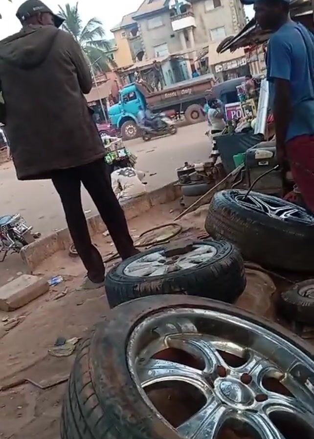 roadside tire repair shop in what appears to be an urban or suburban area. Several tires are visible in the foreground, including tires with chrome rims. Two men are present; one is wearing a blue shirt and red pants, and appears to be working on the tires, while the other, wearing a brown jacket and dark pants, is standing nearby, possibly observing. In the background, there is a truck, other vehicles, and a building. There are also some people walking or working in the background. The ground appears to be dirt or unpaved.