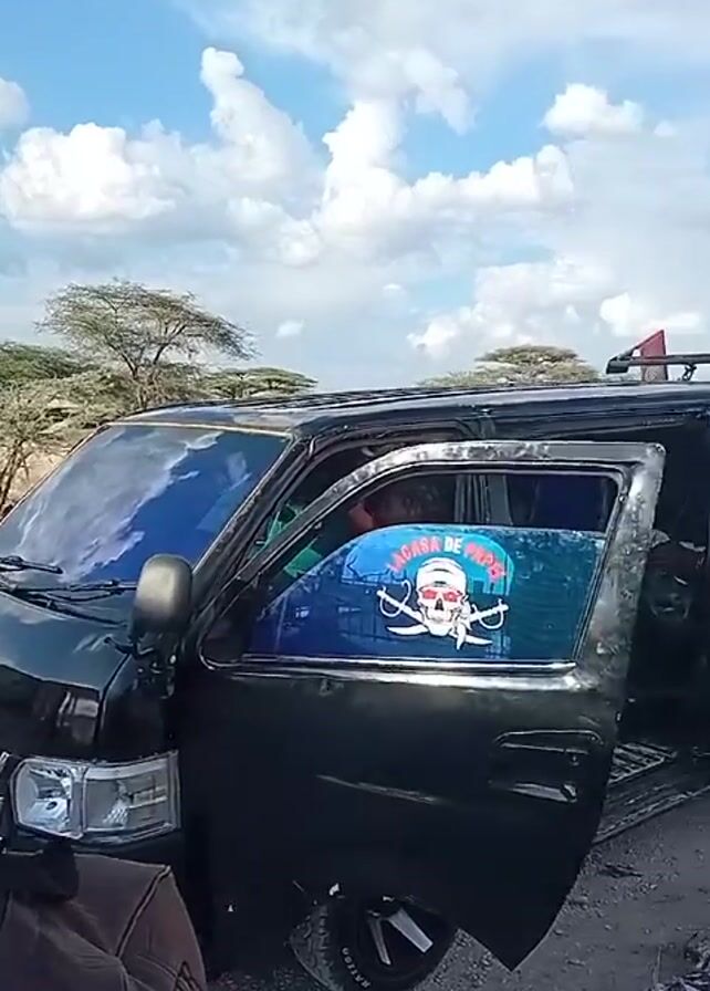 dark-colored van parked on a dirt road in a somewhat rural area. The van's side door is open, revealing a sticker on the window with a skull and crossbones design. A person is standing near the van, looking at their phone. The surrounding environment includes sparse vegetation and a distant view of hills. Another person wearing a red sweater approaches the van. The sky is blue with scattered clouds. There are flags on top of the van. The scene appears to be taken outdoors during daylight hours.