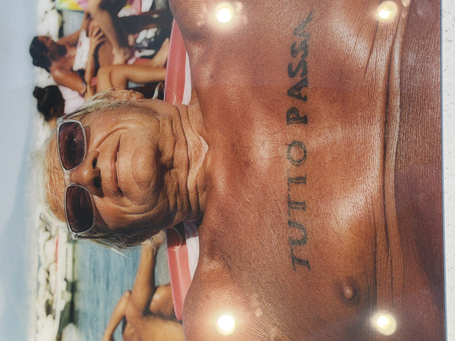 A deeply tanned elderly man with white hair and clear-framed sunglasses is depicted in a close-up, lying on his back in a reddish lounge chair or inflatable. He faces upwards, with a prominent tattoo reading "TUTTO PASSA" in black capital letters across his chest. The background reveals a calm, light-blue body of water, dotted with several small boats. Blurry figures of other individuals are visible relaxing on a distant, rocky shoreline. The scene is brightly illuminated by direct sunlight, creating a high-contrast appearance. Two bright, circular light flares are present on the man's lower chest. This scene is located in the city of Paris, France.