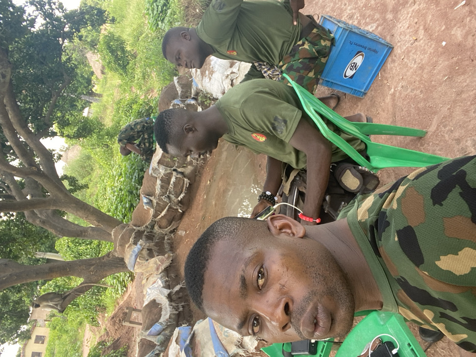 The scene depicts an outdoor environment in Zaki Biyem, Nigeria, populated by four adult males and one primate. In the foreground, a male with short dark hair, wearing a green camouflage t-shirt and possessing distinct facial scars on his left cheek, directly faces the camera with a slight pout, suggesting a self-portrait. He is seated, though his seat is mostly obscured. Immediately to his right and slightly behind, a second male with short dark hair, wearing an olive drab t-shirt with a red and yellow emblem, is seated on a green plastic chair. He is oriented to the right, manipulating a device with attached white and black cables, possibly for charging, and wears multiple black beaded bracelets on his left wrist and a red beaded bracelet on his right. Further to the right, a third male, also in an olive drab t-shirt with a similar emblem and camouflage trousers, is seated on a blue plastic crate labeled "Nigerian Breweries Plc," looking towards the right. In the background, a fourth male in full camouflage uniform is visible, crouched or kneeling amidst dense green vegetation and partially obscured by a large tree trunk. Above him, a green vervet monkey is perched on a tree branch, observing the scene. Across the mid-ground, a series of defensive structures composed of stacked, earth-filled sacks or sandbags forms a barrier. The ground is reddish-brown earth. Lush green vegetation covers the sloped terrain in the background, and distant, rudimentary structures are discernible through the trees. The lighting suggests natural daylight.