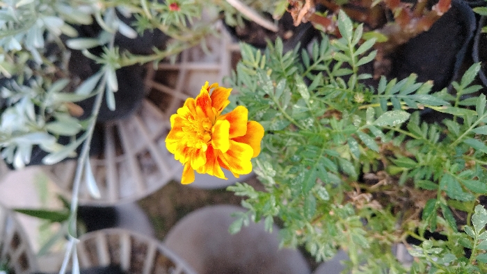 A vibrant, orange and yellow marigold flower blooms amidst a collection of potted plants