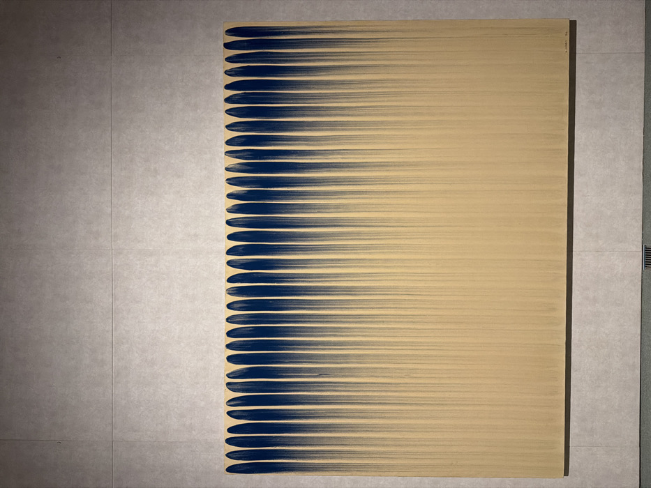 A rectangular art piece is positioned on a tiled surface. It features horizontal, repetitive strokes of dark blue paint, creating a fading effect against a tan or beige background. The strokes are denser and darker on one side, gradually diminishing in intensity as they extend across the piece. The tiles are a light grey color. The art appears to be on a large canvas or board. A drain is visible along the right side of the image.