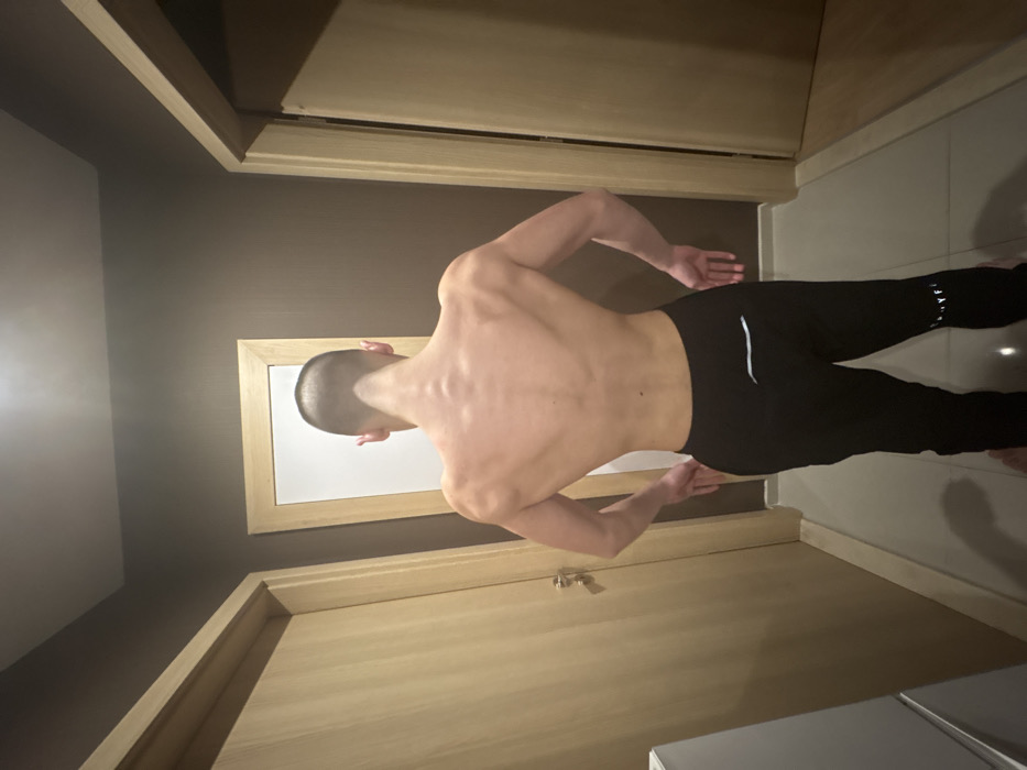 A male individual is depicted from a posterior viewpoint, standing in an indoor setting resembling a residential hallway. The subject possesses a lean physique with visible musculature, particularly in the back and shoulders, and has short, buzzed hair. He is shirtless and wears black athletic pants featuring a horizontal white stripe on the left hip area and partially visible white text on the lower right leg. His hands are placed on his hips, fingers directed downwards. The environment includes dark brown/taupe walls, two light-colored wooden doors (one on the left with a metallic handle, one partially visible on the right), and a mirror with a light wood frame reflecting a white surface. The floor is composed of light-toned square tiles. A white appliance is partially visible on the lower left. Location: Unknown, Unknown.