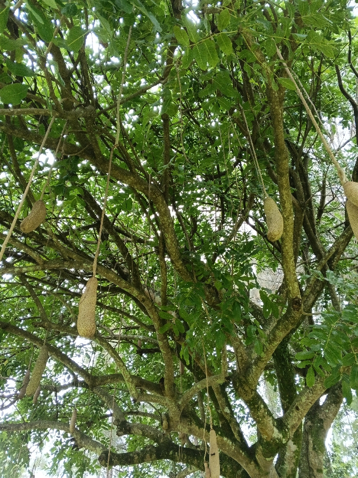 The scene depicts an upward view into the dense canopy of a large, mature tree located in Trairão, Brazil. The tree features numerous thick, gnarled branches, some exhibiting patches of green growth consistent with moss or lichen, which support abundant green foliage composed of compound leaves. Distributed throughout the canopy are approximately a dozen elongated, pendulous fruits, brownish-tan in color, with a textured surface, resembling sausages in form. These fruits are suspended from long, slender, natural stalks. Dappled natural sunlight penetrates the leaf cover, illuminating portions of the branches and foliage. No human figures, animals, or artificial objects are visible within the frame.