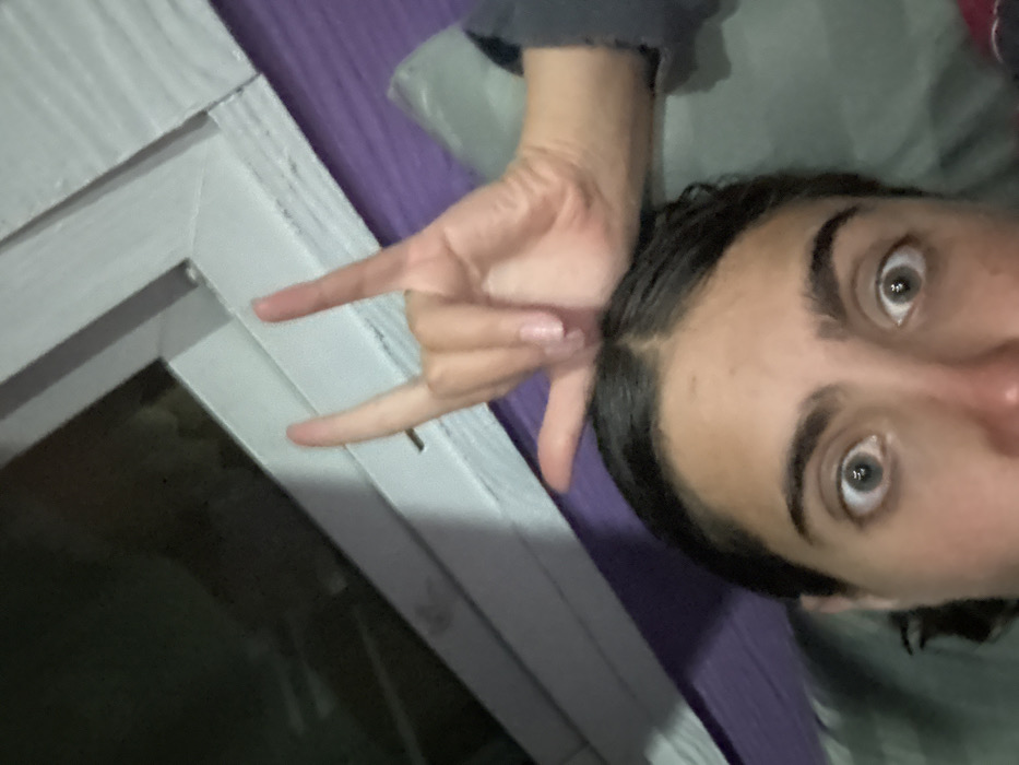 This image depicts a close-up, upward-angled view of a person indoors in Ao Salad, Thailand. The lower half of a light-skinned individual's face is visible, featuring wide-open eyes with light-colored irises, dark eyebrows, and a visible nose. Dark hair with a center part frames the upper forehead. A light-skinned hand extends from the upper right, positioned above the person's head, forming a "devil horns" or "rock on" gesture with the index and pinky fingers extended and other fingers folded. The fingernails have a faint, light-colored polish. In the upper left background, a white window frame with dark, reflective glass is present. To the right of the window frame and behind the person's hand, a purple fabric surface is visible. The lower portion of the image shows a greenish-grey fabric, possibly bedding or clothing.