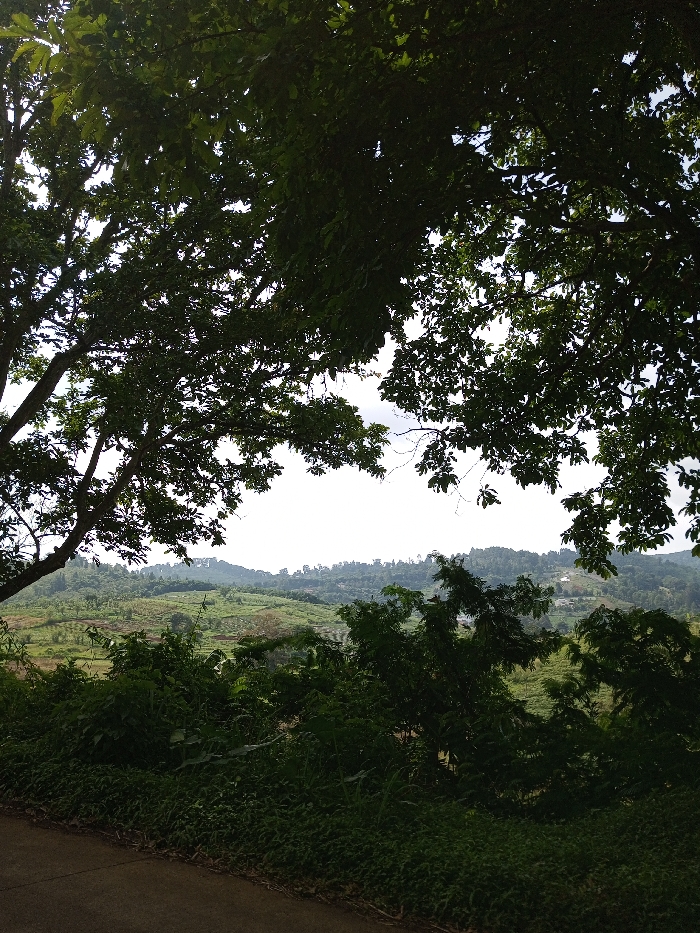 The image captures an elevated landscape view in Matale, Sri Lanka, characterized by natural elements. The foreground features a dark, paved road or path running along the bottom left, bordered by dense, varied green undergrowth and low-lying bushes. Beyond this, a expansive scene of rolling hills extends into the midground and background. These hills are predominantly covered in light green vegetation, indicative of cultivated land or plantations, with some darker patches of trees. A small, light-colored structure is discernible on a distant hillside. The sky occupies the upper background, appearing bright white or light grey, suggesting overcast conditions. The upper third of the image is framed by the dark green, dense foliage and branches of large trees, which are silhouetted against the bright sky, creating an arch-like opening to the distant view. No individuals or man-made structures are prominently visible in the immediate foreground or midground beyond the road.