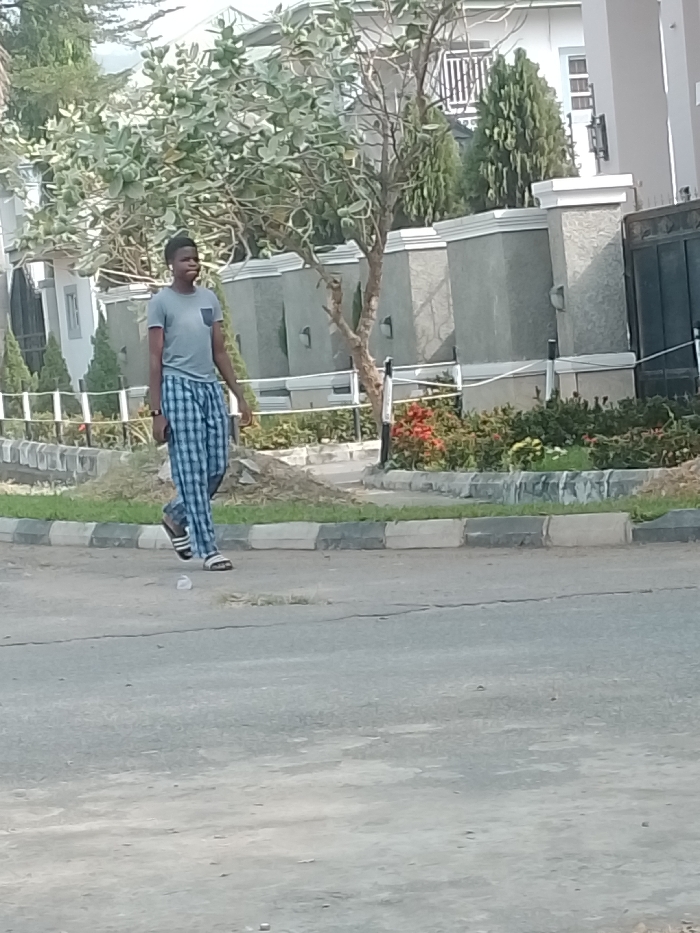 The image displays an outdoor scene on a paved road within the city of Gwarinpa, Nigeria. A young male subject, dressed in a light grey short-sleeved t-shirt with a chest pocket, blue and white plaid pajama-style pants, and black and white striped slides, is captured mid-stride, walking from the left to the right side of the frame. He holds a dark-colored device, possibly a mobile phone, in his left hand, positioned at his side, and has a white earbud in his right ear. His gaze is directed slightly to the right of the frame. A small, clear plastic bottle is visible on the asphalt surface near his right foot. The immediate foreground features a grey asphalt road exhibiting minor cracks. To the right of the road, a curb delineates the paved surface from a grassy median strip. The curb is constructed from blocks alternating in light and dark grey tones. Beyond the median, a small deciduous tree with light green foliage and a thin, light brown trunk is present. Behind this tree and along the curb line, a landscaped area contains various bushes with green leaves and interspersed clusters of red and yellow flowers. In the background, multiple modern residential structures are visible, characterized by white and grey facades and various window designs. One structure includes a decorative white railing on an upper level. A series of grey concrete fence pillars with white caps extends across the background, leading to a dark metal gate on the far right. Evergreen coniferous trees are also part of the landscaping surrounding the structures. The scene is illuminated by natural daylight, suggesting a clear day.