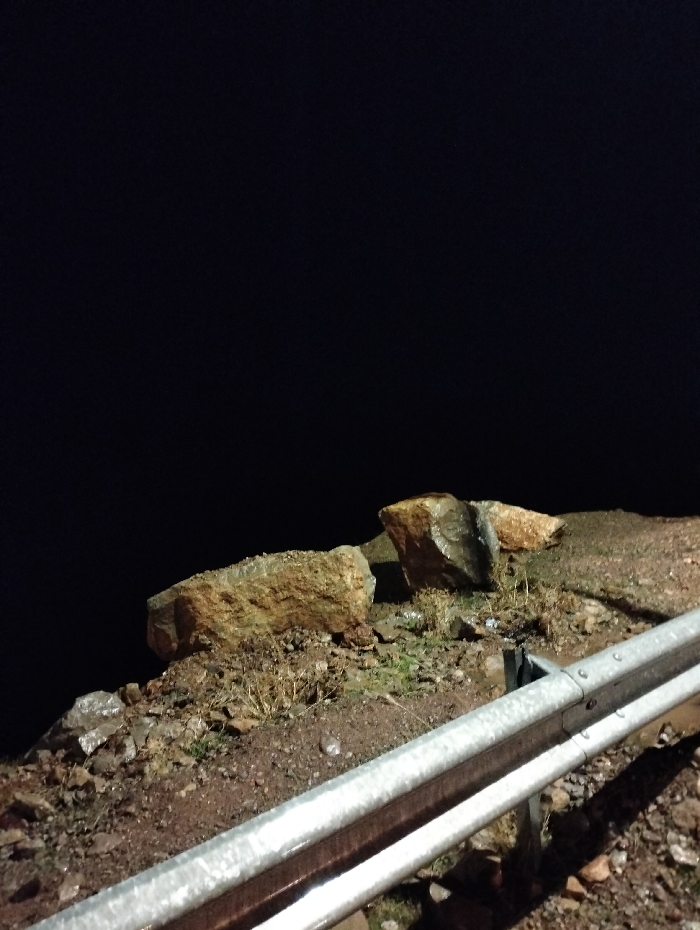 At night, a metallic guardrail borders a steep, rocky terrain. Two large rocks, illuminated by an unseen light source, sit on the edge of the incline amidst sparse vegetation. Smaller rocks and dirt surround the larger formations. The background is entirely dark, suggesting a deep drop-off or an absence of light beyond the immediate foreground. The scene conveys a sense of isolation and potential danger.