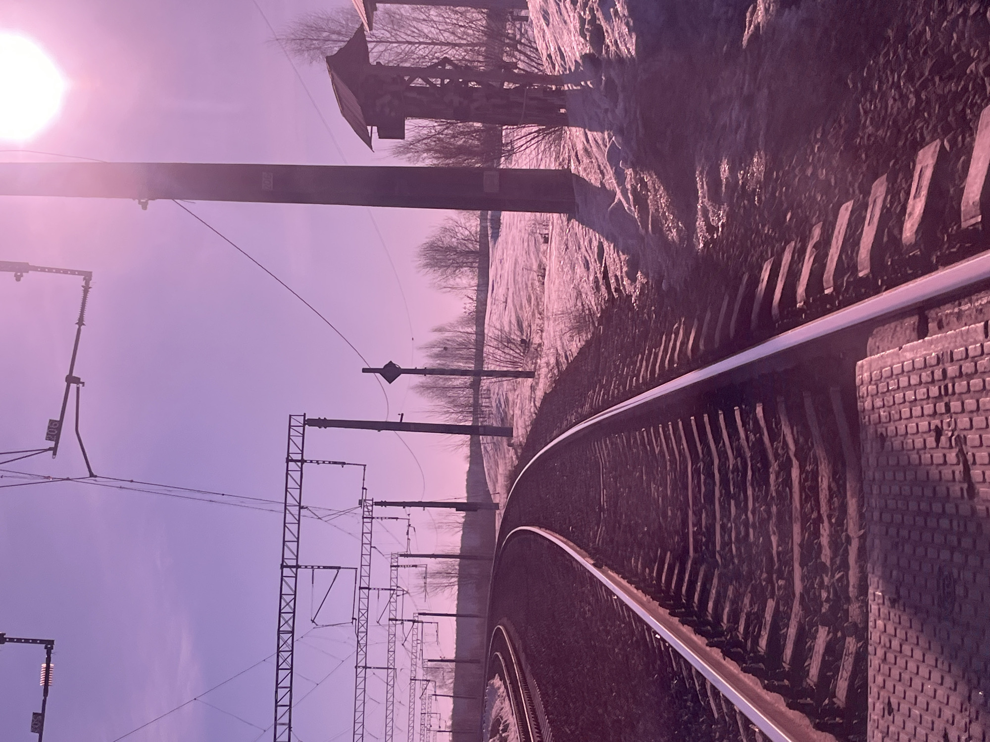 - "An outdoor scene depicts railway tracks under a predominantly purple-pink tinted sky in Kambarka, Russia, likely during a winter or early spring morning or late afternoon due to snow cover and low sun angle" by FM-MtN7u1, licensed under CC BY 4.0