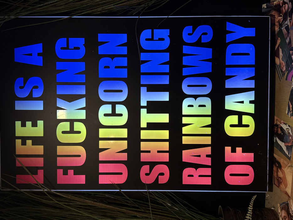 A vertical, internally lit sign is displayed indoors, against a dark background. The sign features bold, sans-serif capital letters on a black panel, framed by a thin white border. The text reads: "LIFE IS A FUCKING UNICORN SHITTING RAINBOWS OF CANDY." Each letter exhibits a color gradient, transitioning horizontally from pink-red on the left, through yellow-green in the center, to blue-purple on the right. To the left of the sign, tall, thin, green reedy plants partially obscure its edge. Below these plants, a brown pot and a smaller patch of dark green foliage are visible on the floor. A thin black electrical wire crosses horizontally over the right side of the sign, near the middle. On the floor directly beneath the sign, multiple printed photographs or magazine cutouts are scattered, depicting various individuals. The ambient lighting of the environment is dim, accentuating the brightness of the sign. The specific location within Tel-Aviv, Israel, is not discernible from the provided image.