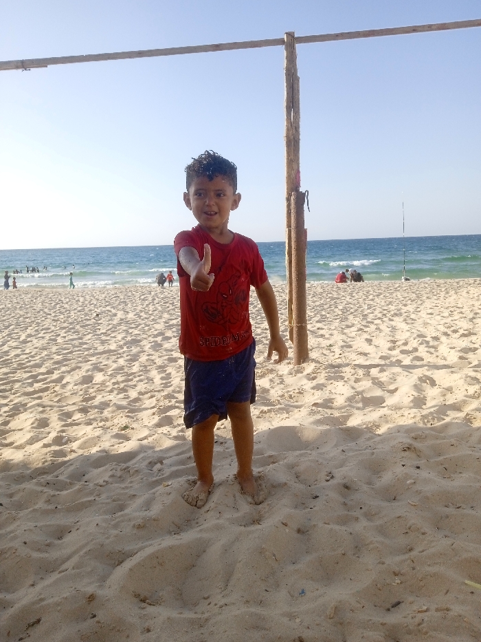- "A young boy stands barefoot on a sandy beach in Al-Mawasi, Palestinian Territories, under a clear blue sky" by FM-cV3b62, licensed under CC BY 4.0