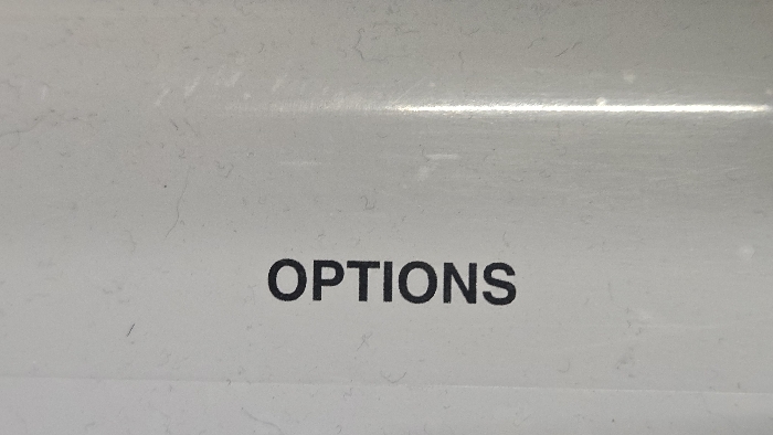 The image displays a close-up view of a light grey, possibly metallic or plastic, surface. The word "OPTIONS" is prominently centered on this surface in bold, black, uppercase sans-serif lettering. The background surface exhibits numerous minor imperfections, including faint horizontal and diagonal scratches, subtle streaks, and scattered dark particulate matter. A distinct horizontal band of specular reflection is visible across the upper portion of the surface, indicating a direct light source. No individuals, other specific objects, actions, or environmental context are present to determine a precise location within the city of Lompoc, United States.