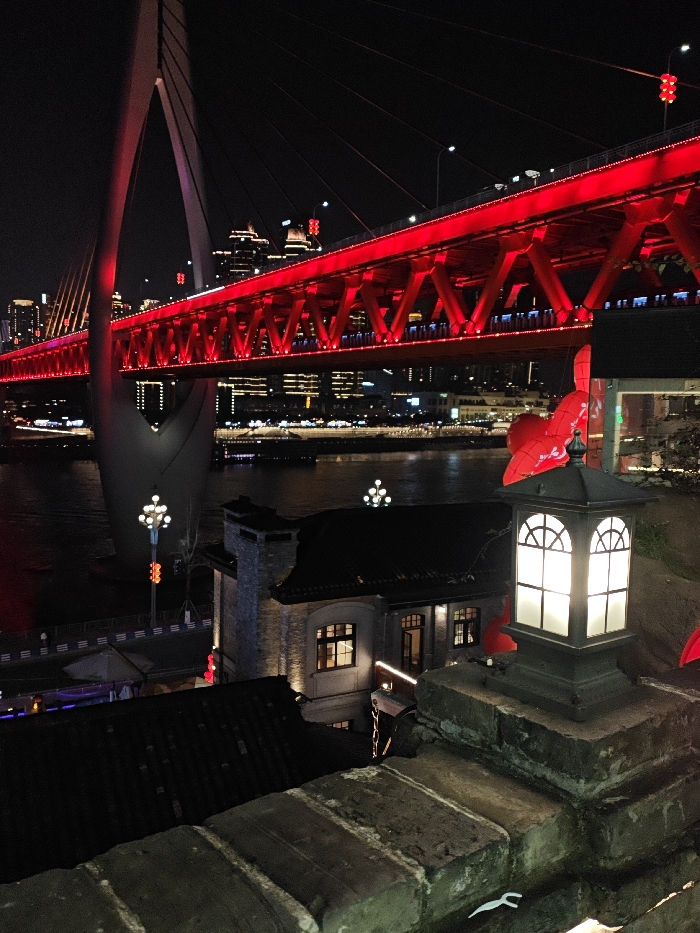 The image depicts a nighttime urban landscape in Nan'an District, Chongqing, China, centered around the Dongshuimen Bridge spanning a river. The cable-stayed bridge is prominently illuminated in red, with its red truss structure clearly visible. A tall, grey-white pylon of the bridge rises on the left side of the frame. Beneath the bridge, a river flows, its surface reflecting various city lights. Several illuminated vessels are discernible on the water. On the distant riverbank, a dense cityscape of numerous illuminated high-rise buildings creates a glowing skyline against the dark night sky. In the midground, below the main bridge structure, a collection of traditional-style buildings is situated along the riverbank. These structures feature dark roofs, light-colored stone or stucco facades, and illuminated windows. One building exhibits a prominent chimney-like element. Multiple streetlights, characterized by spherical clusters of bulbs, are visible along the river's edge and near these midground buildings. In the immediate right foreground, a black, multi-paned outdoor lantern, emitting white light, rests atop a textured, light-colored brick wall. Red decorative elements, possibly lanterns or fabric, are partially visible near this lantern. No human figures are identifiable within the scene.