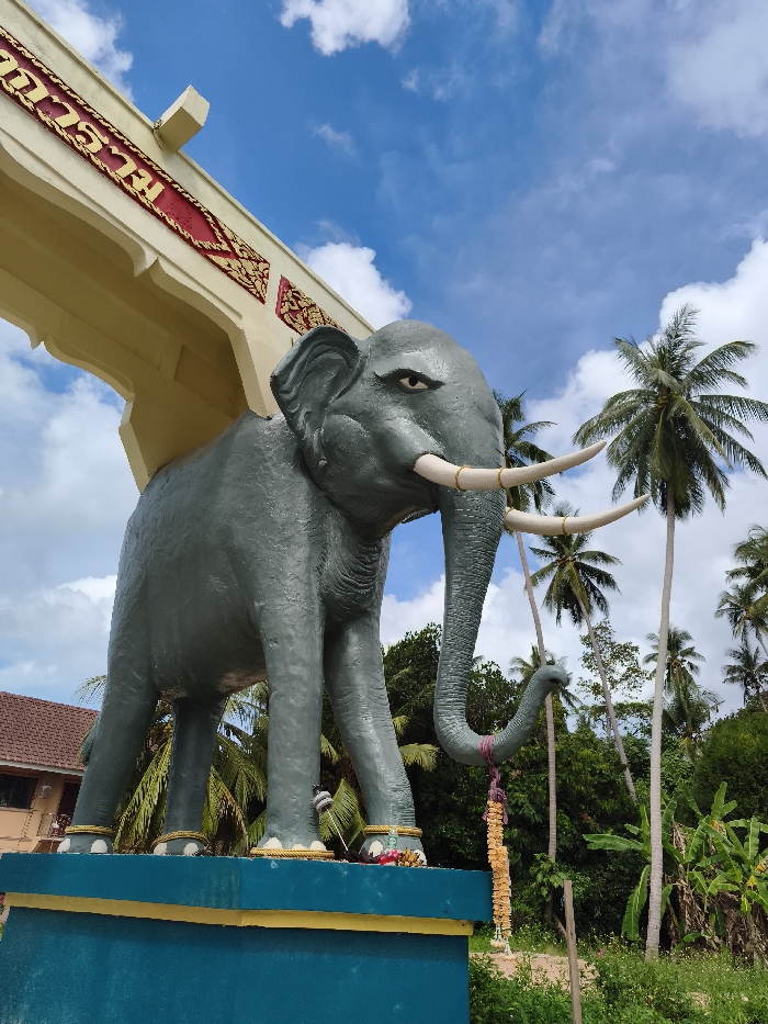 A grey elephant statue stands proudly under an ornate archway, set against a backdrop of a vibrant blue sky dotted with fluffy white clouds. The statue is decorated with gold accents and stands on a blue pedestal. Palm trees rise in the background, contrasting with the lush green foliage that surrounds the base of the monument. The scene suggests a tropical locale with cultural significance.