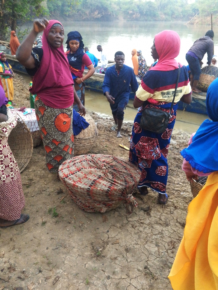 A group of individuals is congregated on a muddy, cracked riverbank in Shikaku, Nigeria. In the foreground, a woman wearing a maroon head covering and a patterned skirt with orange and black motifs gestures with her right hand, her mouth slightly open. To her immediate right, another woman, facing away from the camera, wears a pink head covering, a striped shirt (yellow, navy, red), and a patterned blue skirt, with a black shoulder bag slung across her. Several woven baskets are visible on the ground, alongside a large, round object wrapped in a red, white, and black patterned cloth. In the midground, a man in a dark blue polo shirt is barefoot, stepping out of the murky green-brown river onto the bank. A wooden boat is partially visible at the water's edge, with multiple individuals, some in traditional attire, on or near it. The background features dense green foliage lining the far bank of the river under an overcast or hazy sky. The scene depicts a busy riverside gathering, likely a market or transport point.