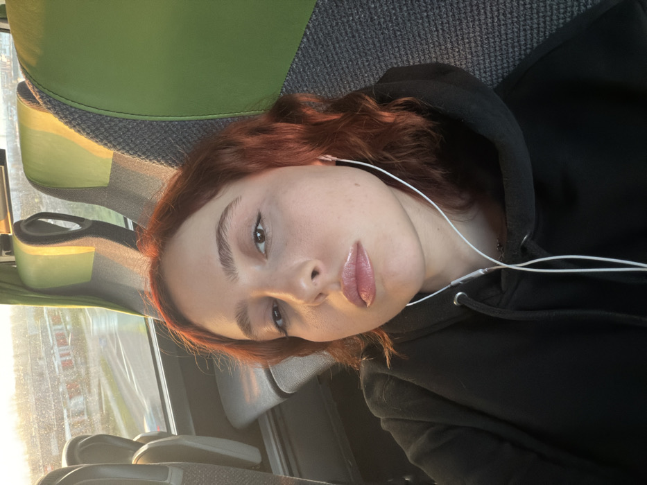 A young woman with reddish-brown wavy hair, light complexion, and brown eyes is depicted in a selfie, looking directly at the camera. She is wearing a black hooded sweatshirt and white wired earbuds are visible, with the wires extending downwards. Her lips appear to have a glossy finish. She is seated inside a vehicle, likely a bus or train, as indicated by the high-backed passenger seats which are upholstered in green and grey fabric. Sunlight enters from the left, casting a warm glow on the woman's hair and the vehicle's interior. Through the window on the left, a multi-lane highway or road is visible, with other vehicles in motion. In the background, beyond the road, industrial or commercial buildings with red roofs can be observed under clear skies. This scene is situated within the city of Brumath, France.