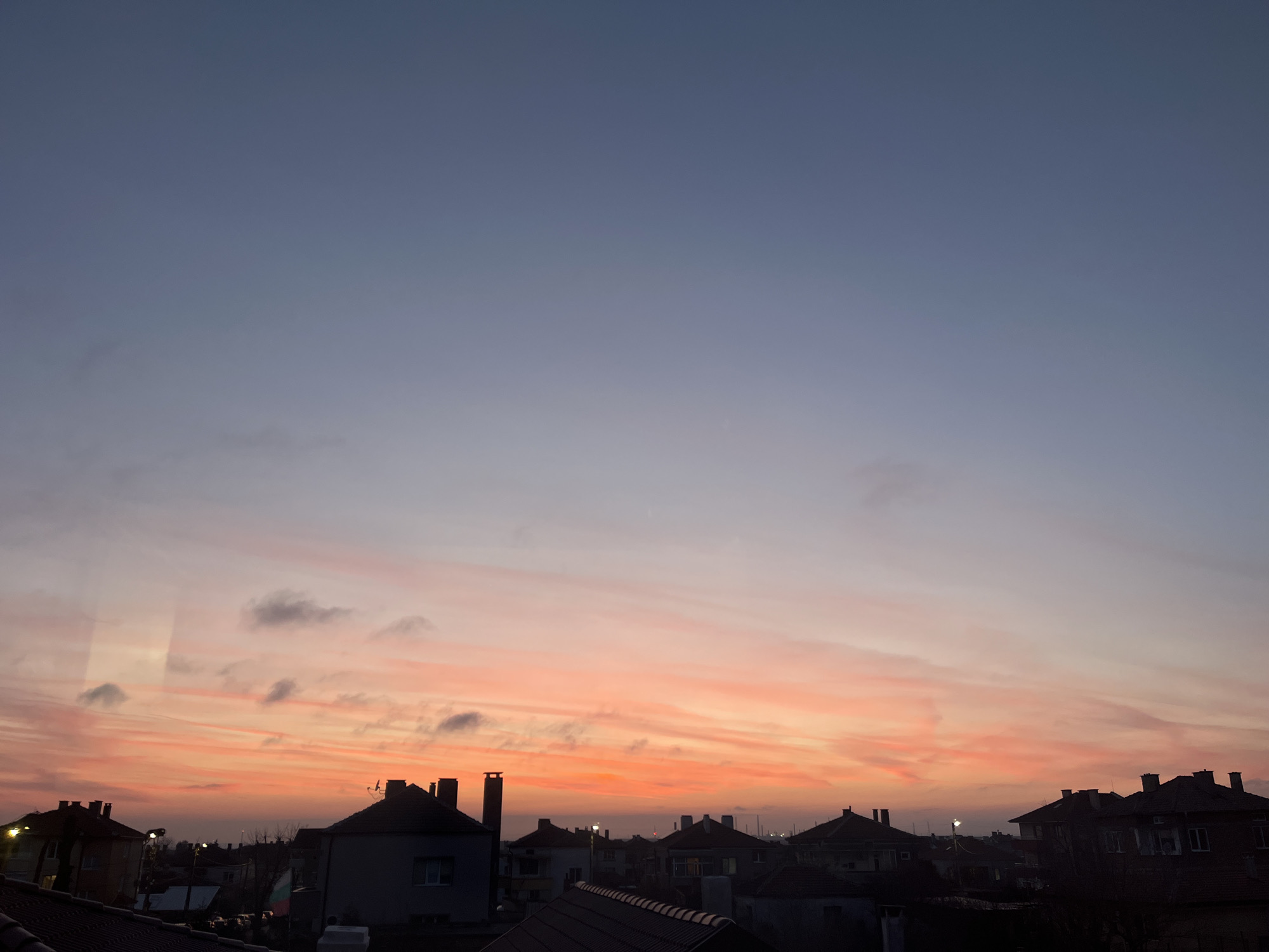 The image displays an urban residential area in Burgas, Bulgaria, captured at either sunrise or sunset. The sky, occupying the majority of the frame, transitions from a deep blue-purple at the zenith to vibrant orange, red, and pink hues across the lower half, indicative of crepuscular light. Wispy clouds, some dark grey and some illuminated by the ambient colors, are scattered across the colorful portion of the sky. Below the horizon line, numerous residential buildings are silhouetted against the bright sky. These structures feature dark, sloped tiled roofs and prominent chimneys. Several streetlights are illuminated, indicating low light conditions. Light is visible emanating from at least one window of a building on the left side of the frame. A Bulgarian flag, partially unfurled, is visible on a building or pole within the mid-left section of the urban landscape. In the far distance, faint lights and structures suggest further urban development or a harbor area. No people or active interactions are visible within the scene.