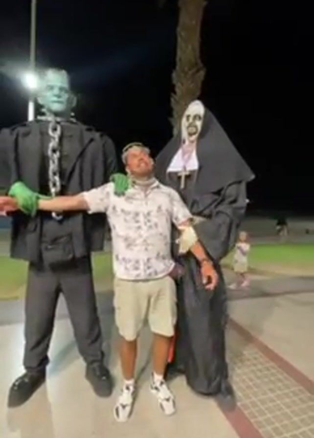 man standing in between two large, costumed figures, one resembling Frankenstein's monster and the other a demonic nun. The man, wearing a floral shirt, khaki shorts, and sunglasses, appears to be playfully scared, with his arms outstretched and a surprised expression on his face. The Frankenstein figure has a chain around its neck and one hand on the man's shoulder, while the nun figure has a large cross around its neck and is also touching the man's arm. The scene takes place outdoors at night, with a brick walkway and a palm tree visible in the background. There are other people, including a small child, visible further away.