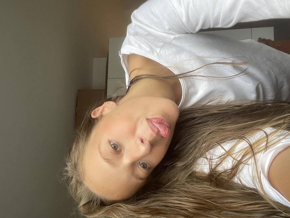 A young woman with wet, long brown hair and fair skin poses playfully, sticking out her tongue. She's wearing a white long-sleeved shirt. Her face is angled slightly, and her blue eyes are visible. In the background, there are hints of a room with white furniture and a cardboard box. She has multiple earrings in her left ear. The light is soft and diffused.