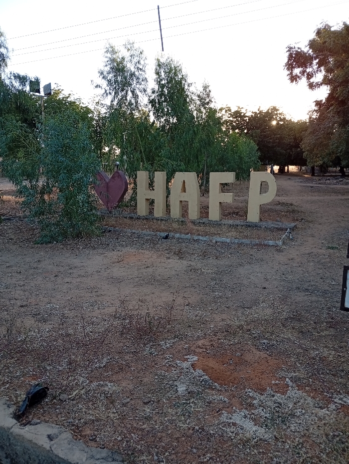 sign spelling out "HAFP" with a heart symbol in place of the first letter. The letters are large, tan, and set on a concrete base. The surrounding area is dry, dirt-covered ground with sparse vegetation. Trees are visible in the background, along with a utility pole and wires. The sky is bright, indicating either early morning or late afternoon light. A glimpse of a signpost can be seen on the extreme right.
