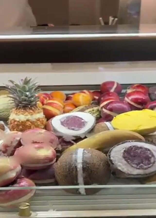display case full of fruit-shaped desserts. A variety of shapes and colors are visible, including representations of coconuts with purple centers, pineapples, peaches or nectarines with striped peels, and bananas. The desserts appear to be frozen or chilled. The display case has a light-colored countertop, and a person wearing a white coat is partially visible behind it.