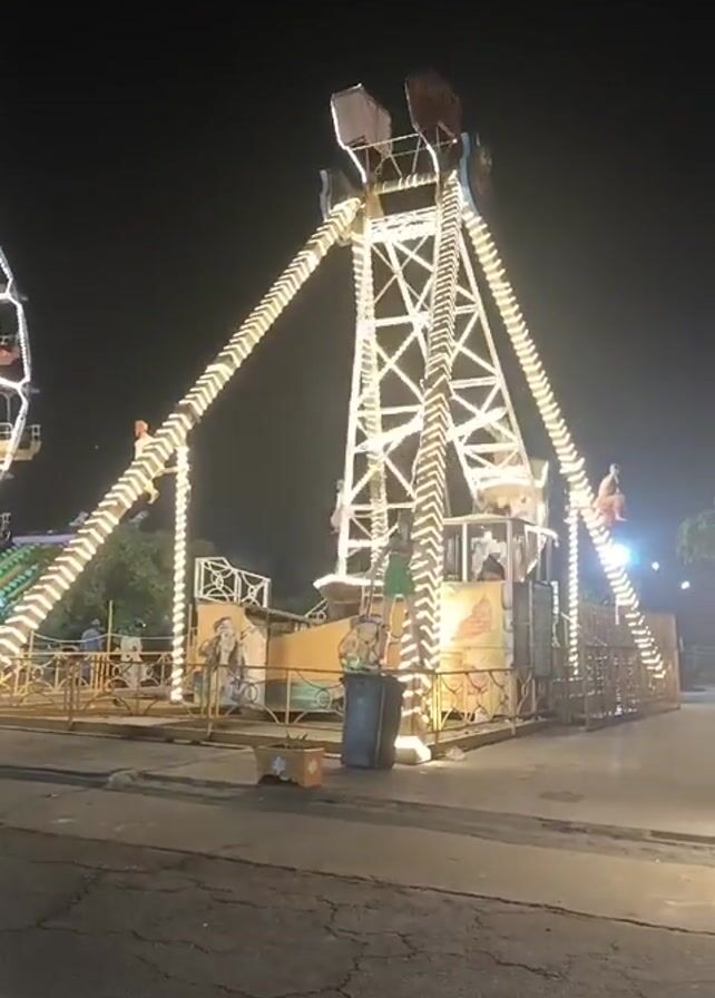 pirate ship amusement park ride lit up at night. The ship is in motion, swinging back and forth. The ride has a yellow and white color scheme, with decorative lighting. People are on the ride. The ride is next to a cracked asphalt road. There is a Ferris wheel visible in the background. A trash can is visible near the ride.