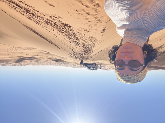 The image depicts a desert landscape, likely Erg Chebbi near Rissani, Morocco, under a clear, bright blue sky with a prominent sun flare in the upper left. In the foreground, a female subject is positioned on the crest of a large, undulating sand dune, taking a selfie. She wears dark, oval-shaped sunglasses, a patterned headscarf in shades of yellow, green, and pink, a light beige ribbed turtleneck top, and large, light-colored circular hoop earrings. Her dark, curly hair is visible around her face. In the mid-ground, further along the dune crest to the right of the primary subject, a white 4x4 off-road vehicle, resembling a Land Rover Defender, is parked. Two additional figures are visible near the vehicle; one is standing next to the driver's side, and another is partially obscured by a dune, appearing to be crouched or positioned low to the ground. The environment consists of numerous vast sand dunes of varying sizes, exhibiting shades of orange and tan, with visible footprints and tire tracks on their surfaces. Shadows cast by the dunes indicate bright sunlight. The background extends into a hazy horizon dominated by more distant sand dunes.