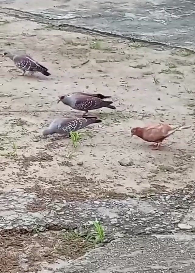 several ground doves foraging on a rough, sandy, concrete surface. Most of the doves are grey with speckles, but one is reddish-brown. They peck at the ground as they search for food. More doves are seen in the background. Small green plants grow in crevices and patches of the concrete.