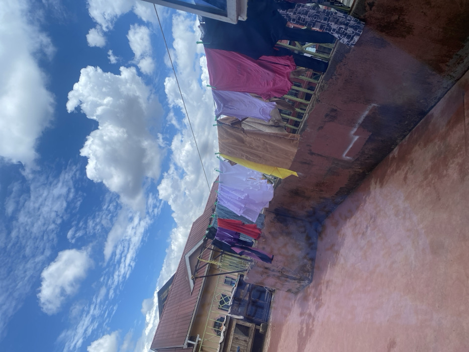The image displays an outdoor residential scene under a bright blue sky with scattered cumulus clouds, indicative of daytime in Nairobi, Kenya. In the midground, a clothesline spans horizontally, laden with approximately 15-20 articles of clothing in various colors including purple, red, white, yellow, brown, pink, black, and patterned fabrics, secured by green and white clothespins. Below the clothesline, a weathered, reddish-brown concrete wall or parapet runs horizontally, bearing a faint white graffiti symbol resembling a lightning bolt on its right section. The immediate foreground shows a flat, reddish-brown concrete surface, possibly a rooftop or patio, with areas of discoloration. In the background, a two-story residential building with a prominent red corrugated iron roof, light-colored walls, and dark metal balcony railings is visible. Partially obscured wooden structures are present in the left background, behind the wall.
