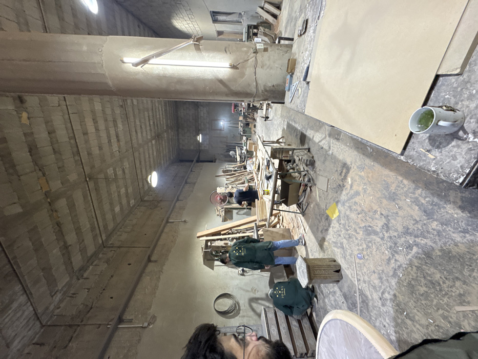 large, open workspace located at 33.447 latitude, 36.278 longitude in Sbeneh, Syria. The workspace appears to be a carpentry shop. Three men are working on various carpentry projects in the shop. One man is bending over a table, looking down at something. Another man is standing to the right of the table, looking at the first man. The third man is wearing a green shirt with the word "JOHNY" on it. He is sitting on a stool, looking toward the camera. Scattered about the room are pieces of wood, tools, and other carpentry equipment. The floor is concrete and is covered in sawdust. The shop appears to be old, with peeling paint on the walls and exposed brickwork. A large, concrete pillar supports the ceiling, which has a rectangular grid pattern. There is a single, hanging light fixture on the ceiling.