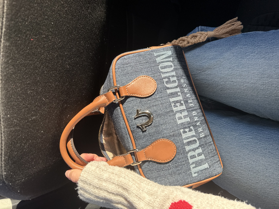 A person's left hand, clad in a light-colored knitted sweater featuring a red circular detail, holds the tan leather-look handle of a True Religion handbag