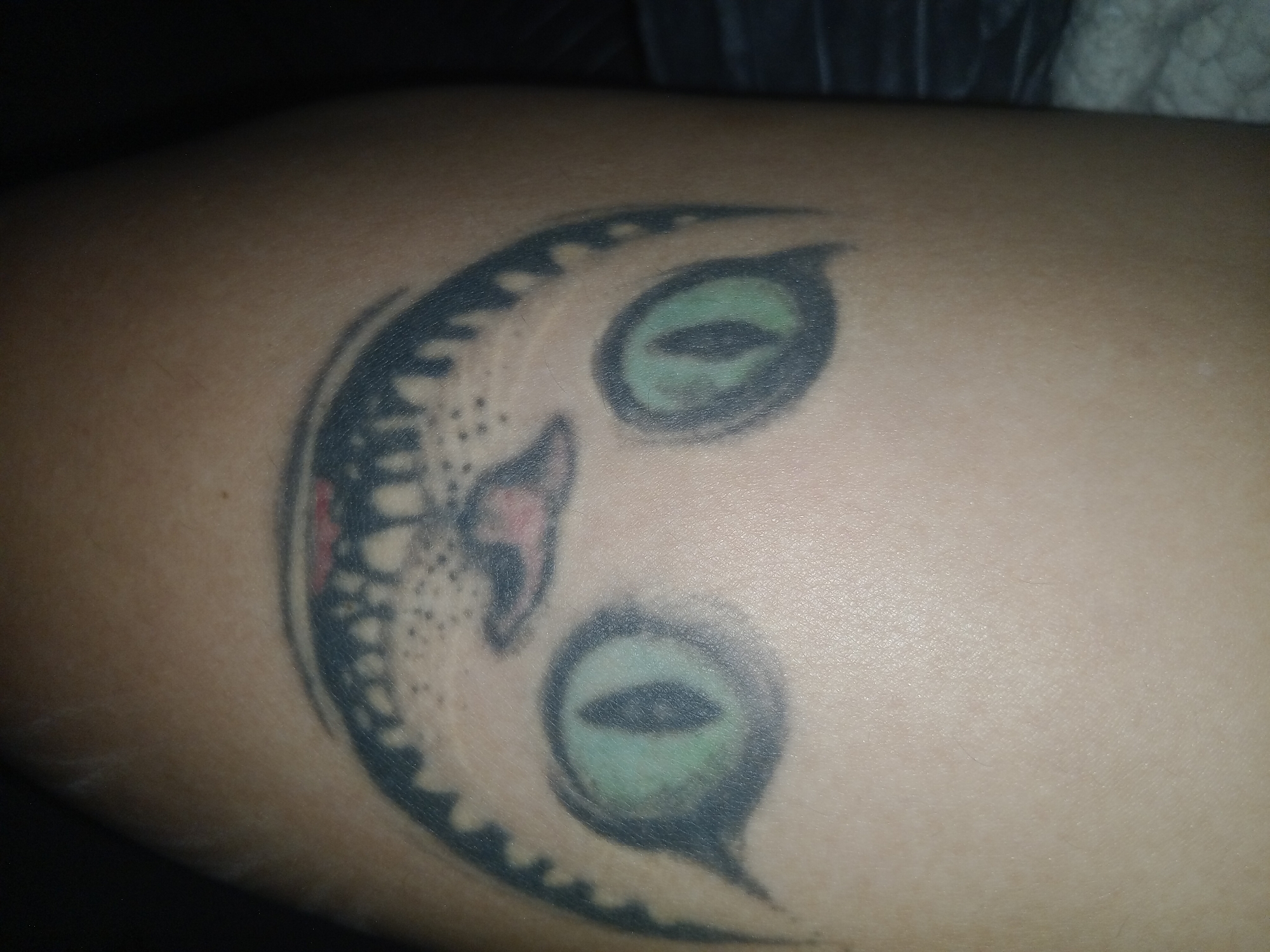 A close-up image shows a tattoo of a cat's face on a person's arm or leg. The tattoo is somewhat faded and appears to depict a stylized cat with large, green eyes, a pink nose, and black outlines. The location is not discernible.