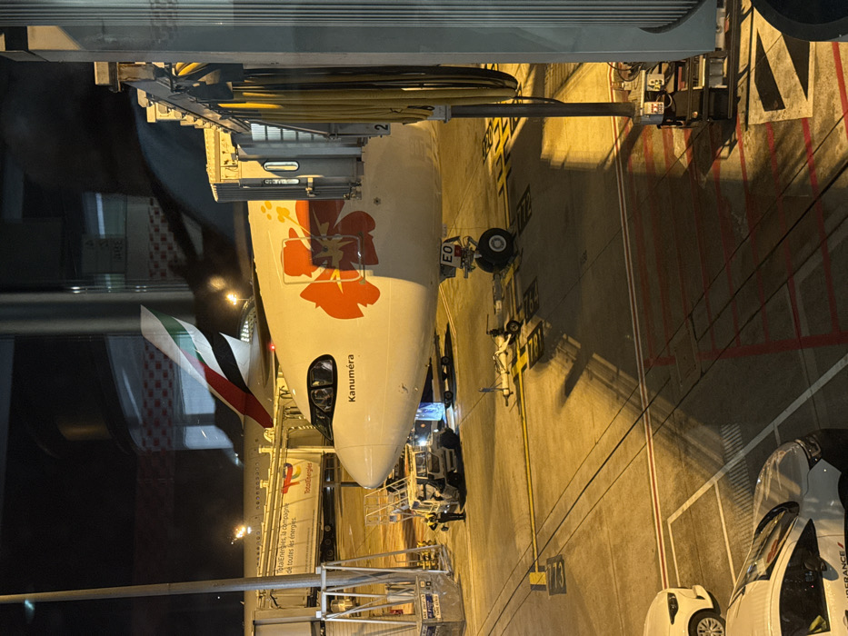 The image depicts a nighttime airport tarmac scene at Paris Charles de Gaulle Airport (CDG), situated within Le Mesnil-Amelot, France. The view is from an elevated perspective, likely from a terminal window or jet bridge. The central subject is a white passenger aircraft, identified by the name "Kanuméra" below its cockpit windows and a prominent red and orange hibiscus flower livery on its forward fuselage. This aircraft's nose landing gear is extended, and its front section is connected to a jet bridge, partially visible on the right side of the frame with yellow coiled cables. A white pushback tug is positioned near the aircraft's nose, and one individual in a high-visibility vest stands adjacent to the tug. In the background to the left, the vertical stabilizer (tail fin) of another large passenger aircraft is visible, displaying the distinctive red, white, and green striped livery of Emirates Airlines. Adjacent to this background aircraft, a piece of ground support equipment bears the text "TotalEnergies, la compagnie de toutes les énergies." The tarmac is marked with yellow and red lines indicating operational zones. The entire scene is brightly illuminated by artificial light sources, resulting in strong shadows and reflections across the concrete surface. In the lower-left foreground, two white vehicles are partially visible, with one displaying "LIBERFRANCE" on its side. The environment indicates active ground operations are underway.
