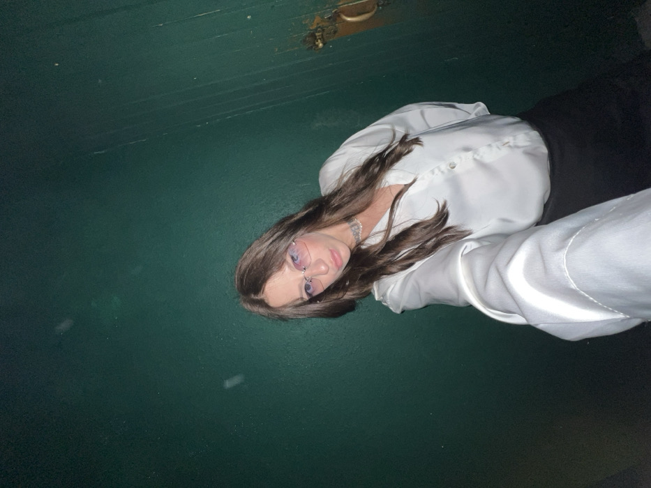 A woman with long brown hair poses in a dimly lit room with dark green walls. She wears pink-tinted glasses, a white button-up shirt, and a silver necklace. A portion of her black pants is visible on the upper right. A metal latch or hinge is visible at the top center of the image, indicating a door or compartment. The photo is slightly rotated counterclockwise.