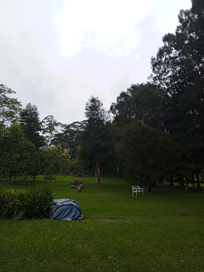 - "A sprawling green lawn fills the foreground, punctuated by a blue tarp-covered object and a dense bush on the left" by FM-FkmTA2, licensed under CC BY 4.0
