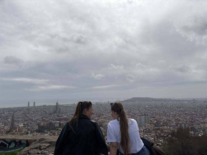 The scene captures two individuals, viewed from the rear, situated on a rocky, graffiti-marked elevated platform overlooking the city of Barcelona, Spain. This vantage point is consistent with the Bunkers del Carmel. The individual on the left, with dark hair tied back and wearing a black jacket, is turned to face the person on the right. The individual on the right, with light brown hair flowing down and wearing a white top and blue jeans, faces generally forward. The expansive cityscape of Barcelona unfolds beneath them, characterized by a dense grid of buildings extending to the Mediterranean Sea visible on the horizon. Twin skyscrapers are discernible near the coastal margin in the left background. The sky is uniformly overcast with grey clouds, indicating an overcast day.