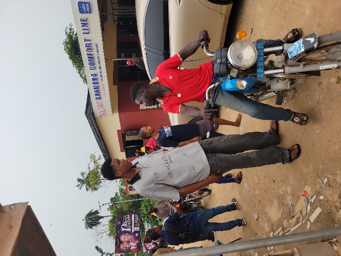 The image presents an outdoor street scene in Egbagu, Nigeria, under an overcast sky. In the foreground, two males are the primary subjects. On the left, a tall male wears a light grey polo shirt, dark grey wide-leg pants, and black flip-flops. He has short dark hair and is facing towards the right. To his right, a male is seated on a light blue motorcycle. This individual wears a red t-shirt with a gold-colored design near the collar, blue jeans, and brown sandals, possessing short dark hair and a beard, and is looking left towards the taller male. The motorcycle features a light blue fuel tank, a silver-toned engine block, a circular headlight, and orange turn signals. A blue plate below the headlight displays "ZAKKHAN" in white letters. The ground is unpaved, dusty, and sandy, with visible scattered debris including papers and plastic wrappers. In the mid-ground, a single-story building with a tan upper facade and a dark red lower section is prominent. A sign on this building reads "SO.LTD ANAMBRA COMFORT LINE," identifying it as "A TRANSPORT AND LOGISTIC COMPANY" with routes like "LAGOS - ABUJA." A gold-colored sedan is partially visible, parked in front of this building behind the motorcycle. Additional individuals are present throughout the scene. To the left of the central figures, a male in a blue shirt and jeans with a black backpack stands. A female in a dark blue t-shirt and dark skirt is visible further back. In the background, other figures, including one wearing a red hat and another with a yellow hard hat, are discernible. On the far left, a large billboard displays an image of two men. Palm trees and other vegetation are visible beyond the structures in the background. A partial view of a brown structural element, possibly a roof overhang, is present in the upper left corner.