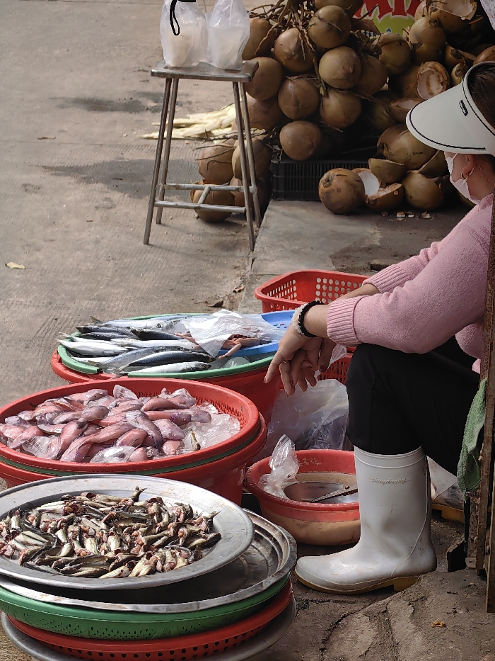 The scene depicts an outdoor market stall in Vỹ Dạ Ward, Vietnam. In the foreground, multiple containers display fresh fish on a worn concrete surface. The lowest visible container is a silver-colored metal tray filled with numerous small, dark fish, some showing visible entrails, resting on stacked green and red plastic baskets. Above it, a large red plastic tub holds numerous pinkish-red fish embedded in ice. Behind this, another red plastic tub contains larger, silvery fish along with a plastic bag holding smaller, reddish marine creatures. To the immediate right, a smaller red plastic basket contains a light brown bowl with liquid and a metal utensil, alongside a plastic bag. A person is seated on the right side of the frame, partially visible. They wear a light pink long-sleeved shirt, black trousers, a white visor, and a white face mask. Their hands are clasped, displaying a dark beaded bracelet on the left wrist and a ring on the left ring finger. White rubber boots cover their feet. In the background, a large mound of brown coconuts is piled on a black plastic crate and the concrete ground; some coconuts are whole, while others are partially husked or cracked. To the left of the coconuts, a silver-colored metal stool stands, holding two clear plastic bags on its seat. A green cloth hangs vertically on the right side, adjacent to the seated individual.