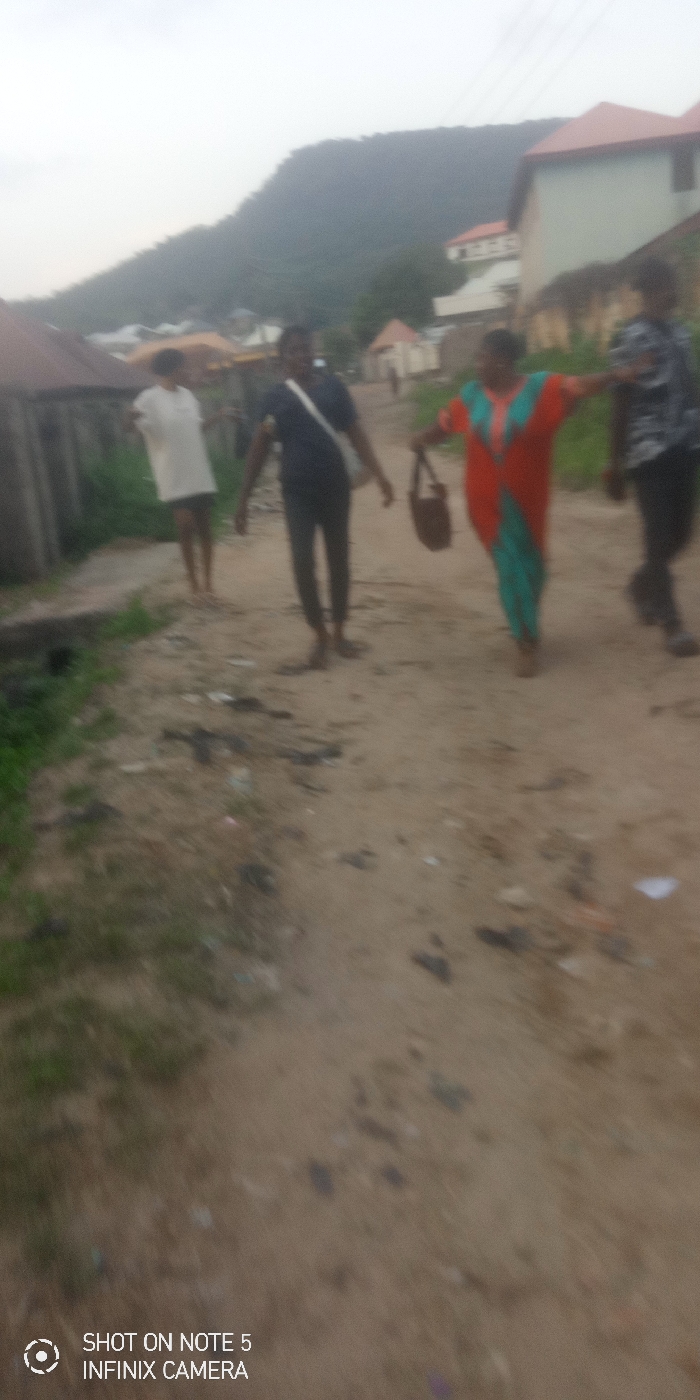 A blurry outdoor photograph depicts a street scene in Lokoja, Nigeria, under overcast daylight conditions. Four individuals are walking across a dirt path that occupies the lower and central portions of the image. **People:** From left to right: 1. An individual wearing a white short-sleeved top and light-colored shorts or a short skirt. 2. An individual wearing a dark t-shirt, dark trousers, and a white shoulder bag slung across their body. 3. An individual, centrally positioned, wearing a loose-fitting garment with a prominent vertical design in orange and teal/green. This person carries a brown handbag in their left hand. 4. An individual on the far right, wearing a dark, possibly patterned, short-sleeved top and dark trousers. All four individuals appear to be walking in the same general direction along the dirt path. Footwear is indistinct for all due to blur, though some appear to be barefoot or wearing very simple, dark footwear. No direct interaction or specific actions beyond walking are discernible. **Environment and Objects:** The ground consists of an uneven, light brown dirt path, littered with scattered debris including small pieces of plastic, paper, and dark organic matter. Patches of green vegetation (grass and weeds) line the edges of the path. On the left side, a low, dark-colored fence or wall is visible, bordering the path, with a simple structure behind it. On the right, a multi-story building with light-colored walls and a reddish-brown tiled roof is partially visible. Further back, other buildings with various roof colors are present, indicating a residential or semi-urban area. The background is dominated by a large, heavily vegetated hill or mountain range. The sky is overcast and light gray. Faint power lines or communication cables are visible in the upper right section of the image.