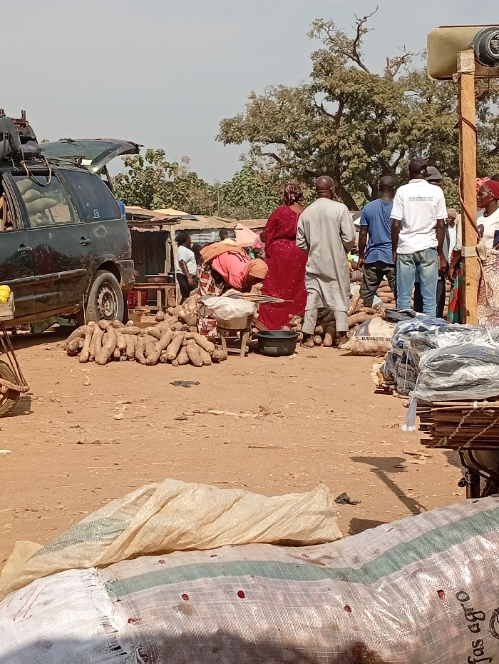 The scene captures an outdoor market activity on unpaved, dusty ground, likely within an unnamed city's commercial district. Piles of light-brown tubers, consistent with yams, are centrally displayed directly on the ground. Several individuals are gathered around these piles; prominent figures include a person in a red dress, another in a light grey tunic, a male in a blue t-shirt, and a male in a white t-shirt and blue jeans, all primarily facing away from the camera. In the left mid-ground, a dark-colored minivan with its rear hatch open and items on a roof rack is parked. To the far left, a yellow object, possibly a container on a wheeled cart, is partially visible. In the foreground, several large white woven sacks, some marked "fas AGRO" and containing reddish produce, are visible on the ground. In the mid-ground right, a tall wooden pole supports a grey horn-shaped loudspeaker. The background features rudimentary structures constructed with corrugated metal sheets, along with sparse green foliage and a large deciduous tree under a clear, bright sky.