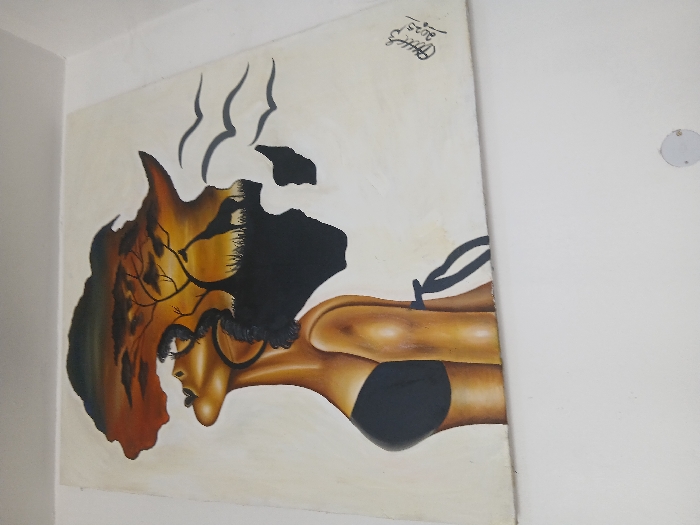 This image depicts a painting mounted on a light-colored wall, located in Gura Top, Nigeria