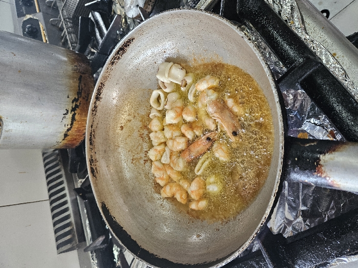 The image depicts an overhead view of a commercial kitchen cooking scene. A wide, round, silver-colored metal pan is centered, containing numerous peeled shrimp, two larger whole shrimp, and several white squid rings actively cooking in bubbling golden oil. The pan rests on a black gas stovetop burner, partially covered with crumpled aluminum foil. In the blurred background, a large, heavily stained, dirty aluminum pot is visible on an adjacent burner. Other elements of a commercial kitchen range, including metal grates and a ventilation system, are discernible. No individuals are present in the frame. The specific city location of Cascais, Portugal, cannot be determined from the visual information provided.