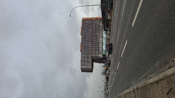 The image displays a wide exterior view of a modern urban environment in Niederanven, Luxembourg, under an overcast, grey sky. A multi-lane asphalt road with white dashed and solid lane markings dominates the foreground and midground, running diagonally from the lower-left to the center-right. A concrete curb separates the road from a dirt and gravel verge on the far left. Vehicles are present on the road, indicating active traffic. In the midground, from right to left, a dark-colored SUV occupies the central lane, followed by a lighter-colored SUV in the adjacent left lane. A dark SUV is visible further back in the leftmost lane. On the far right, a grey van is parked next to a narrow strip of low vegetation and what appears to be construction materials or debris. The primary subject in the background is a multi-story modern building characterized by a prominent, multi-level cantilevered section extending horizontally to the left. The building's facade features a pattern of vertical, possibly metallic or composite, panels alternating with glass windows, with larger glass panes visible on the lower levels. The upper portion of the building exhibits a curvilinear or undulating roofline. A tall, dark street light pole with a curved arm overhangs the road on the right side of the frame. Additional street lights and road signs are discernible in the distance along the left side of the road. No individuals are clearly visible or identifiable within the scene.