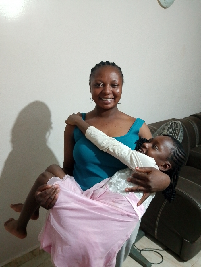 A woman wearing a blue tank top smiles at the camera while holding a girl. The girl is dressed in a white top with lace detailing and a long pink skirt. The woman stands in front of a white wall, casting a soft shadow, and a partially visible couch and fan. Both the woman and girl have braided hair.