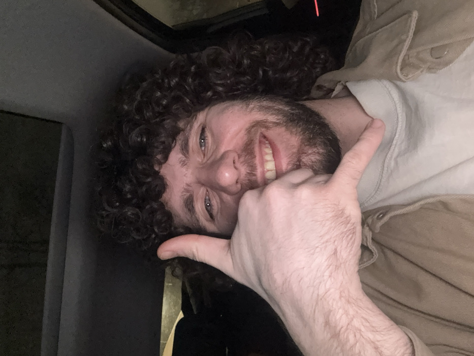 A smiling male individual with dark, curly hair, a beard, and blue eyes is depicted in a close-up, seated inside a vehicle